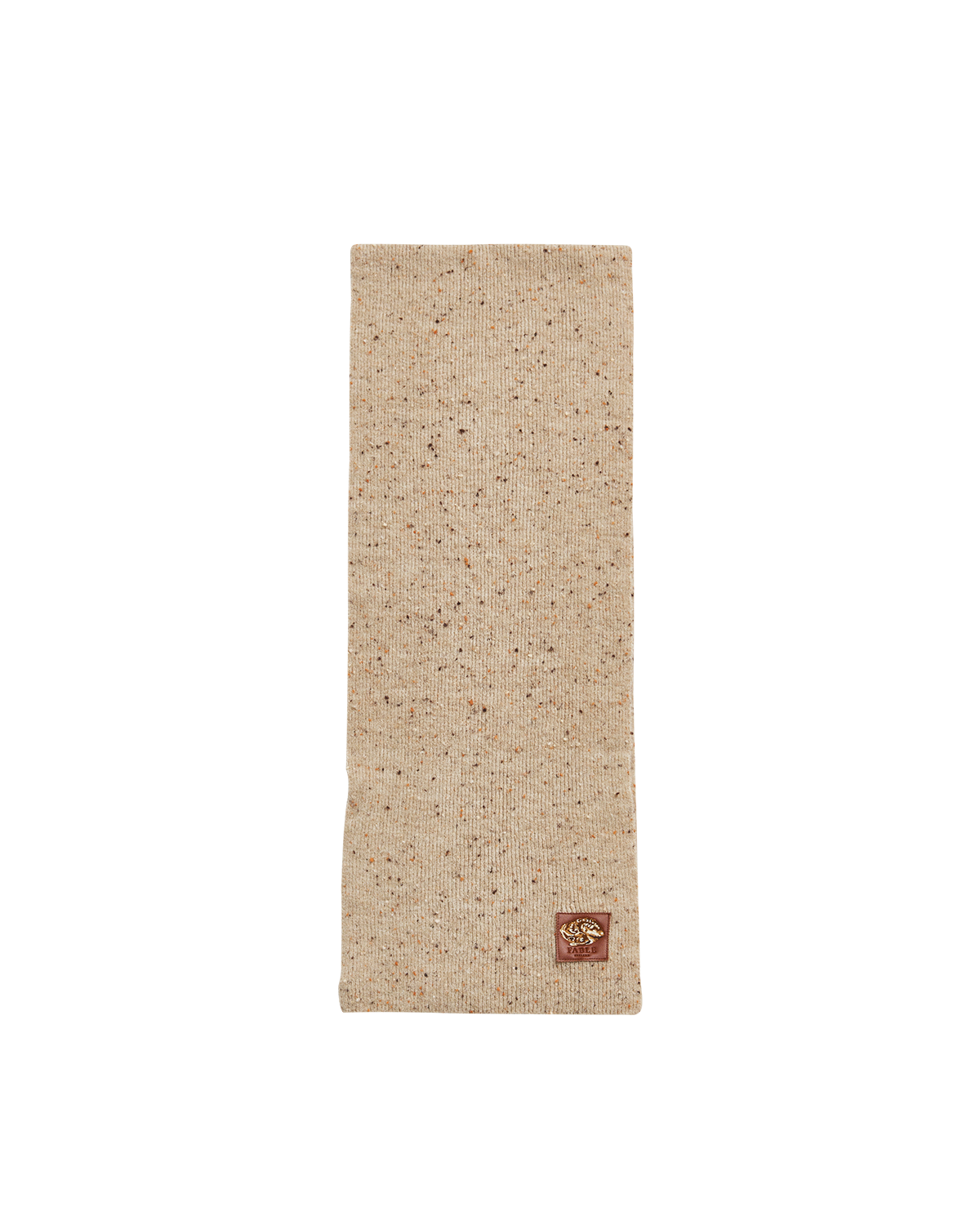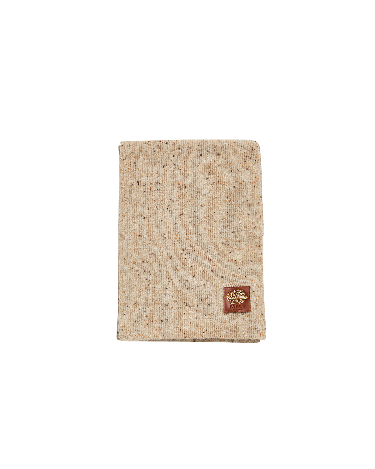 Taupe knitted scarf with a Fable England logo on a white background