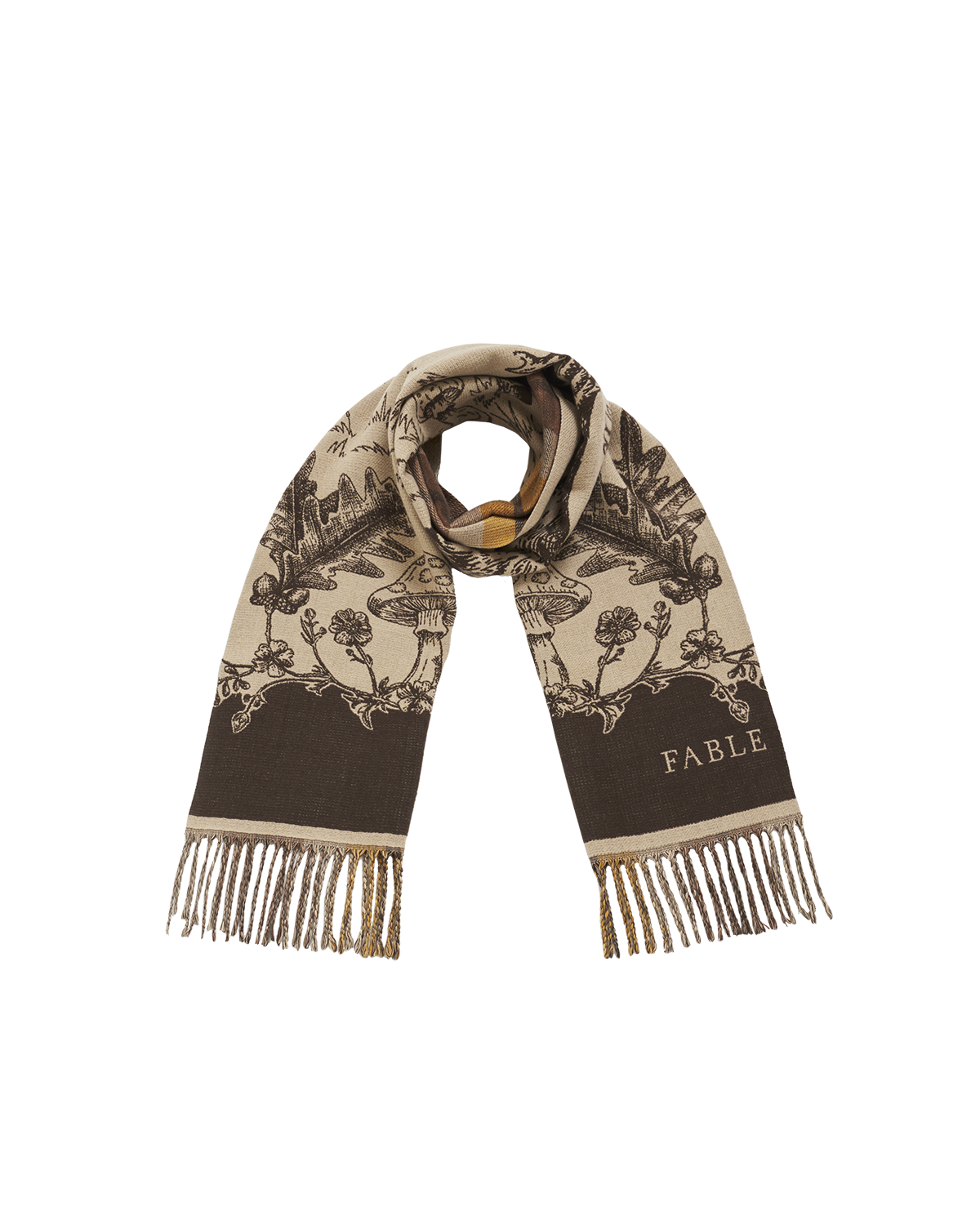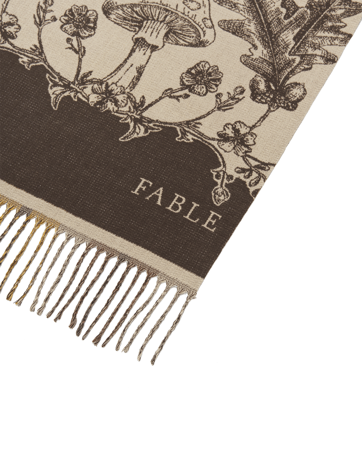 Scarf with floral pattern and 'FABLE' branding on a white background