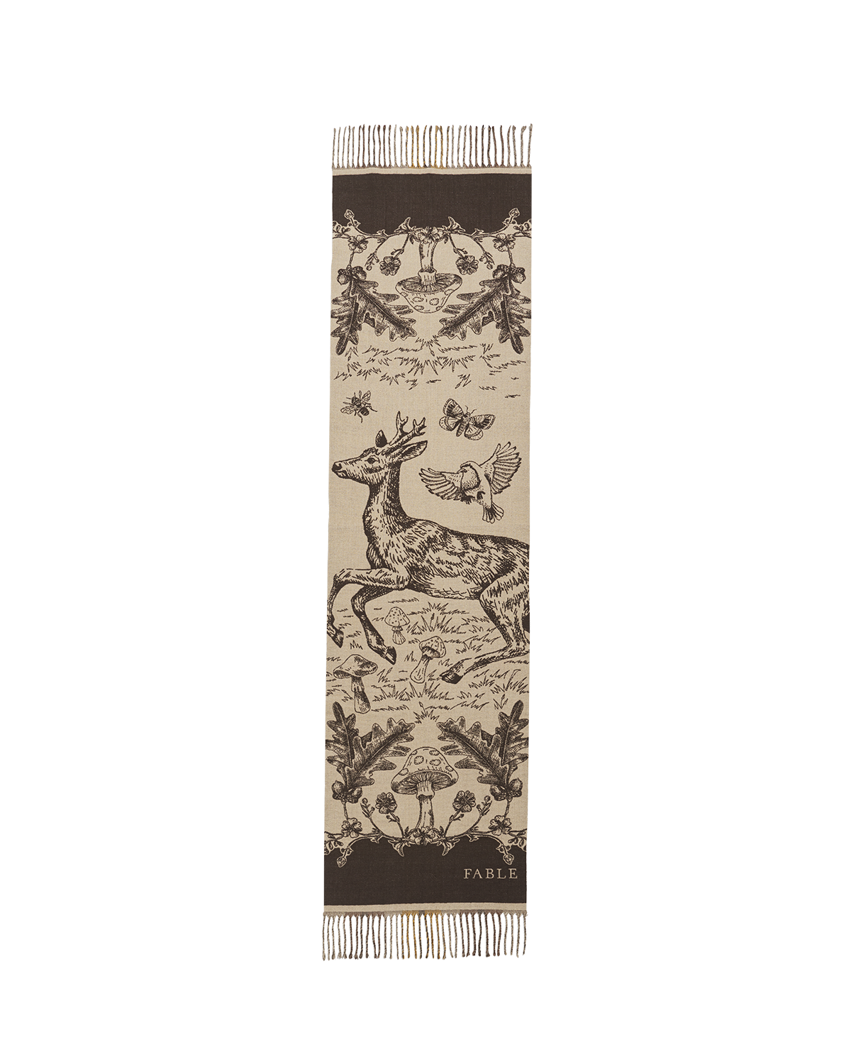 Woman wearing a black coat with a decorative scarf featuring deer and bird patterns on a white background