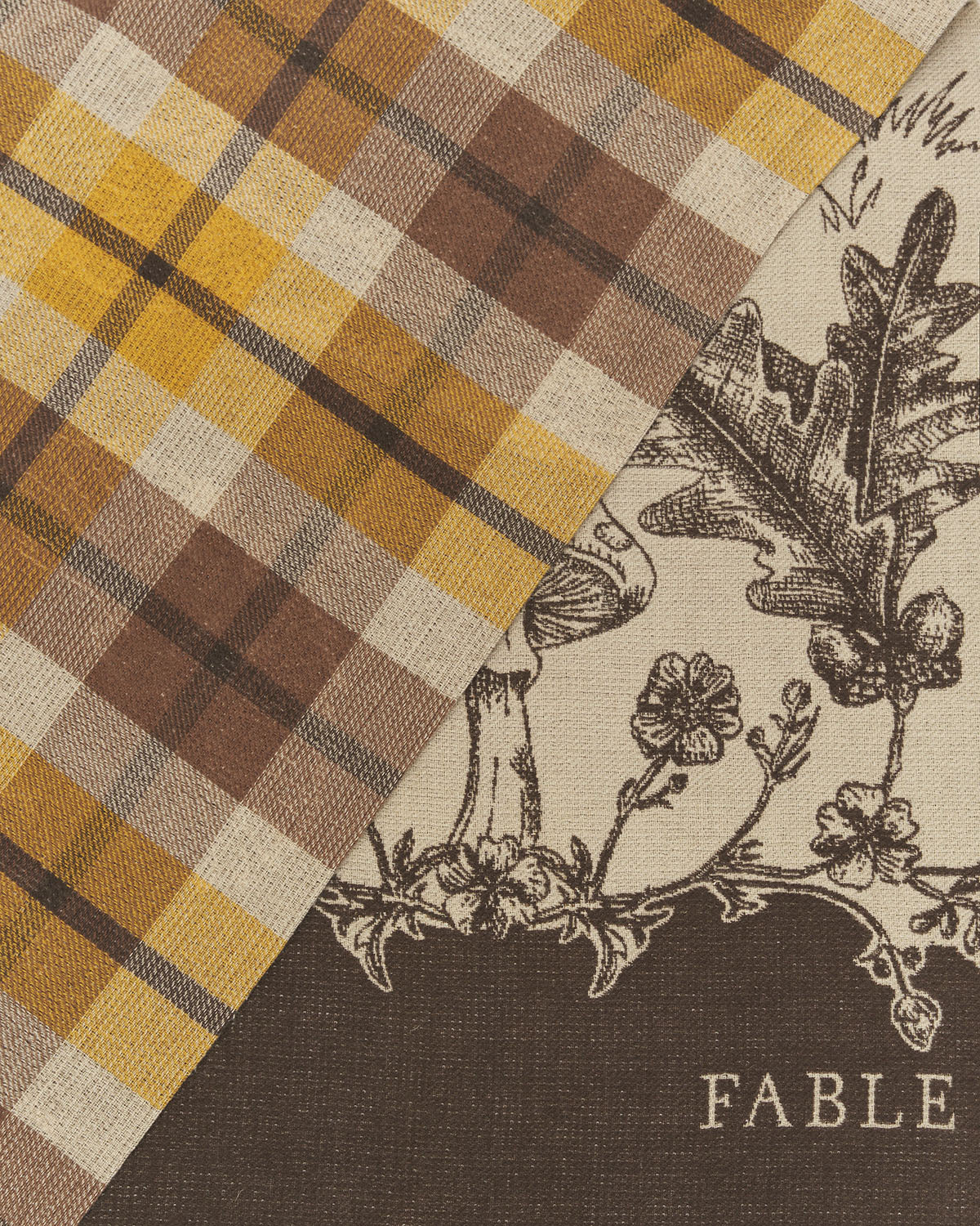 Fabric with plaid pattern and nature-themed design, featuring the brand 'Fable'.